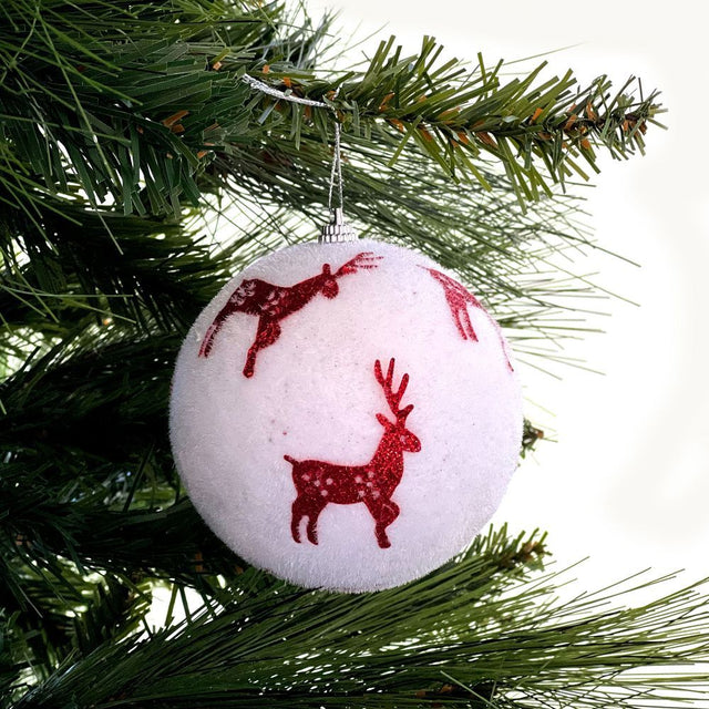 🦌 Esfera Red Deer 8 cm – Blanca con Renos Rojos en Glitter
