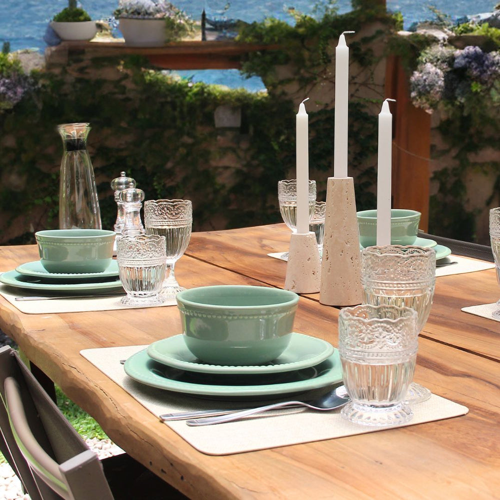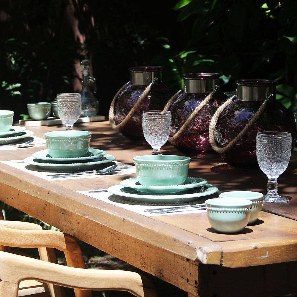 El diseño con perlas en relieve y el tono verde agua aportan frescura y elegancia a tu mesa, con una estética que no pasa de moda.