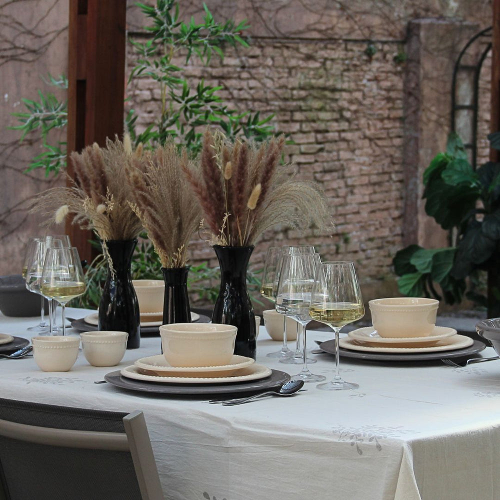 Con su tono crema suave y borde perlado, este juego combina elegancia atemporal con la practicidad que buscás para el día a día.