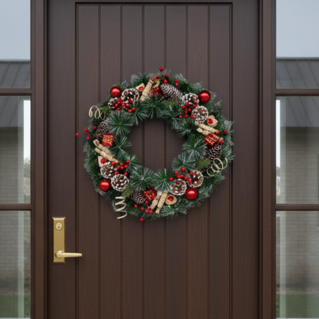 Confeccionada con ramas verdes, piñas nevadas, berries rojos y esferas brillantes, combina lo natural y lo festivo en una pieza única que transforma cualquier espacio con calidez y elegancia.