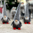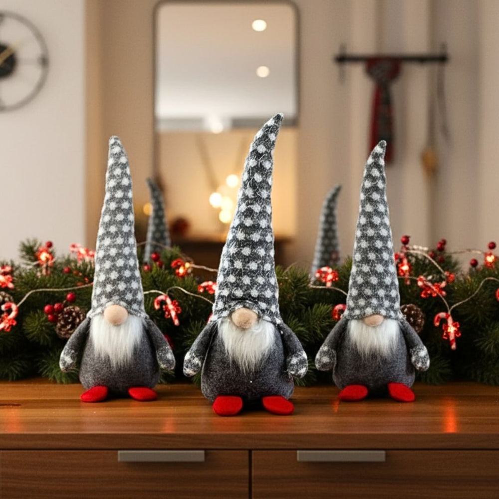 El Gnomo Grey 45 cm es pura magia 🎄. Con su gorro alto tejido en tonos grises con lunares blancos, barba suave y botitas rojas, este simpático personaje llena de encanto y calidez cualquier rincón de tu hogar.
