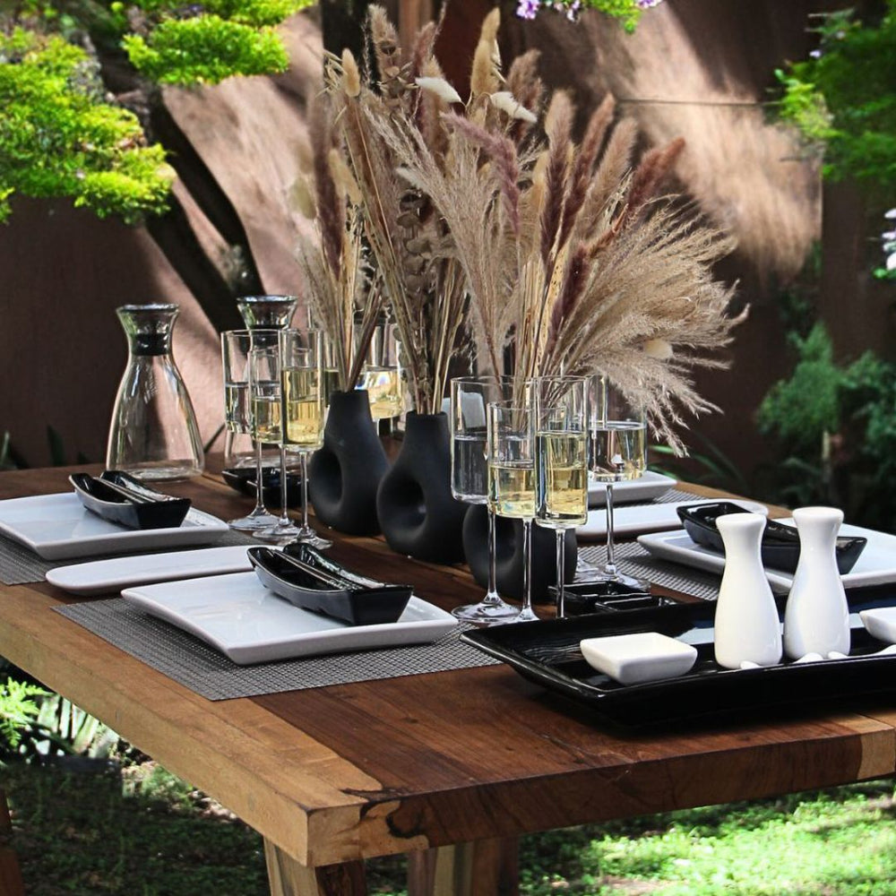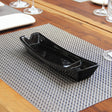 Diseño alargado con división para salsa, ideal para presentar sushi, rolls o bocados asiáticos con un toque moderno y minimalista.