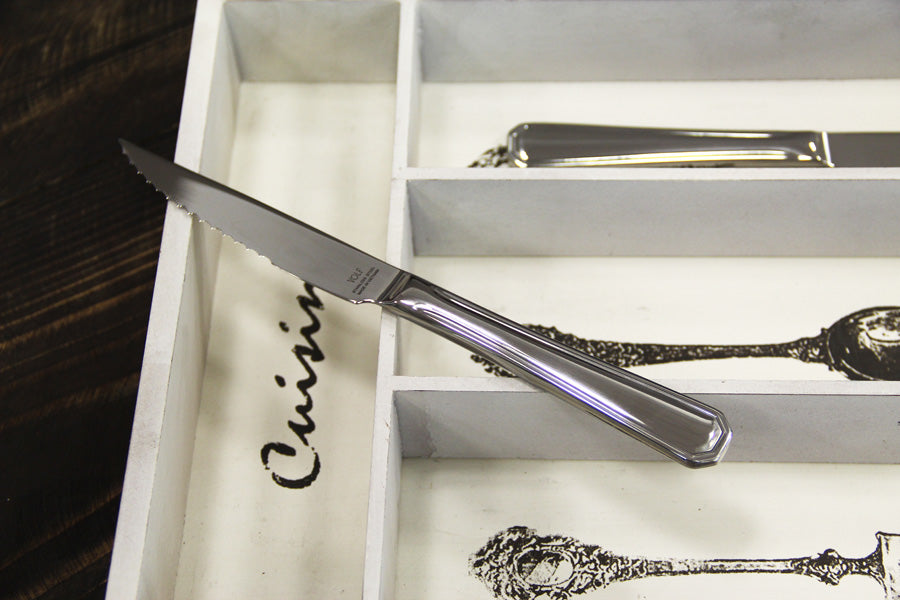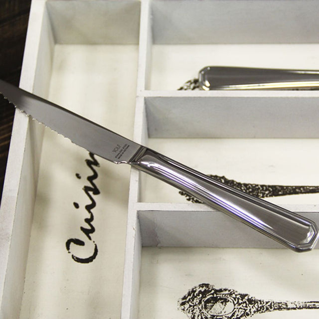 Diseño facetado y filo dentado que combinan estilo con funcionalidad. Ideal para cortar carnes, verduras y todo lo que se cruce en tu plato con elegancia 👌.