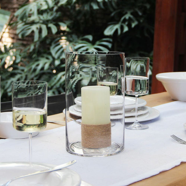 Este florero tipo fanal tiene un diseño sencillo y minimalista, con una estructura cilíndrica de vidrio transparente.