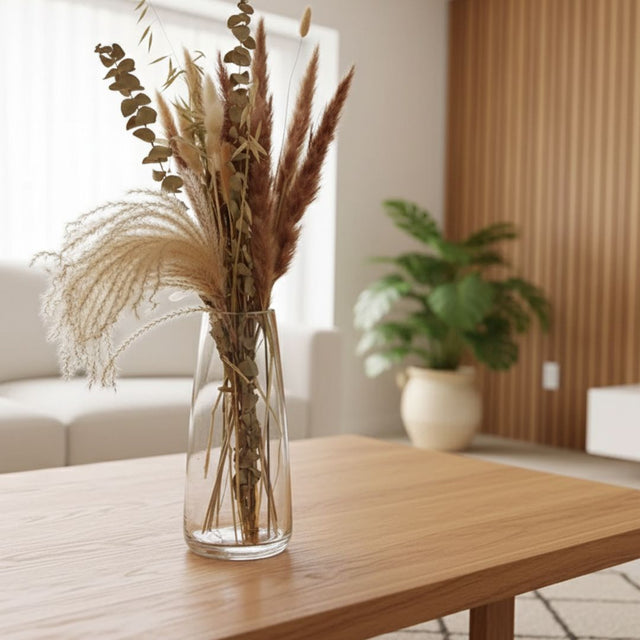 La base ancha asegura estabilidad, lo que lo hace ideal para arreglos florales altos o para exhibir ramas decorativas.