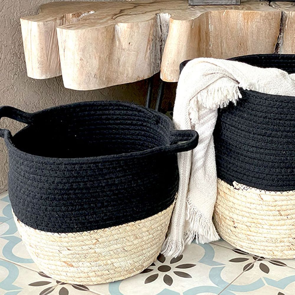El Set de Canastos Yamba x2 combina diseño natural y funcionalidad moderna. Hechos con base de seagrass trenzado y borde superior en algodón negro, aportan textura y contraste a cualquier espacio.