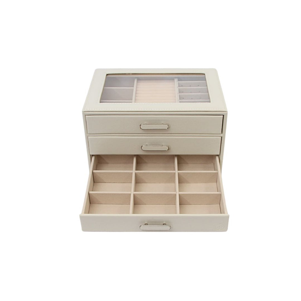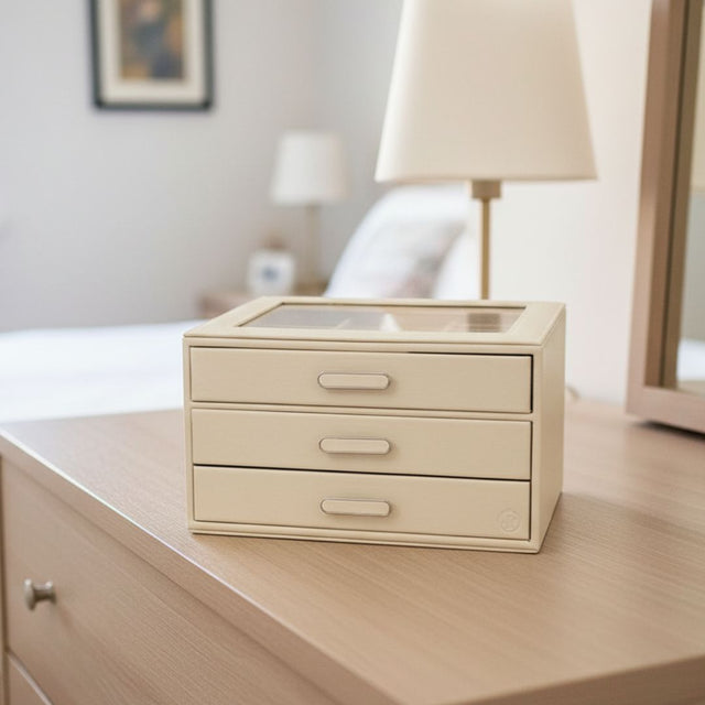 Fabricado en materiales de alta calidad, su estructura firme y su interior aterciopelado protegen cada accesorio de rayaduras y daños. El acabado en color crema aporta un aire minimalista y delicado, convirtiéndolo en un objeto decorativo además de funcional.