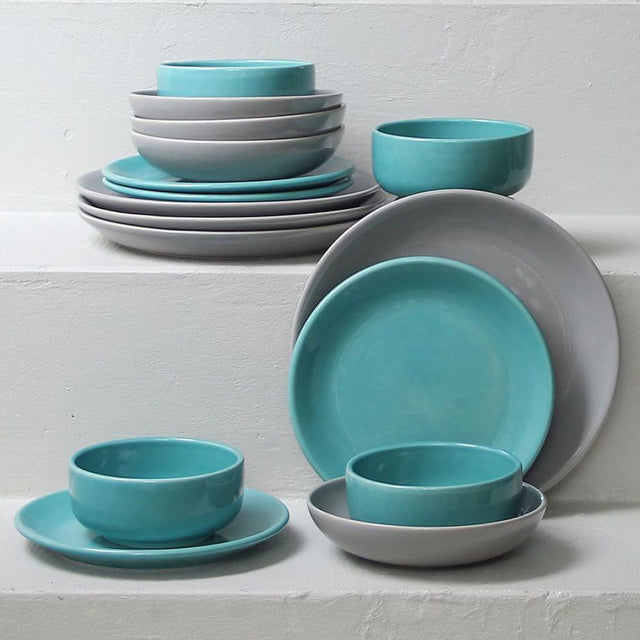 Una propuesta de vajilla que fusiona la calidez del gris piedra con la frescura del turquesa. Su diseño simple pero distintivo transforma cualquier comida en una experiencia visual placentera.