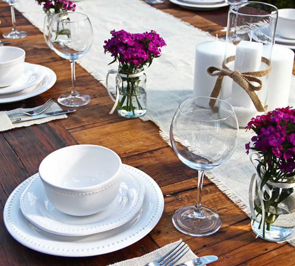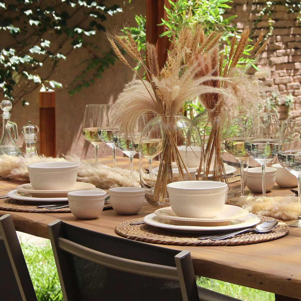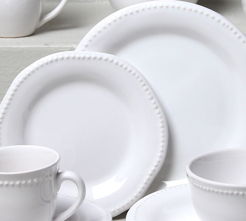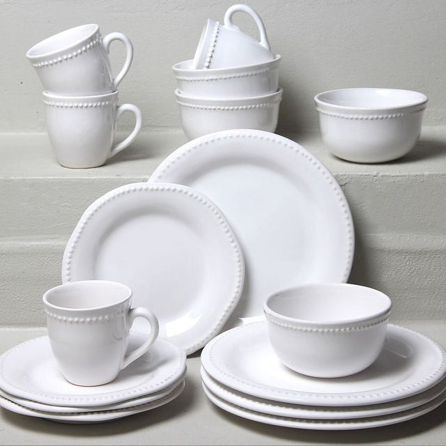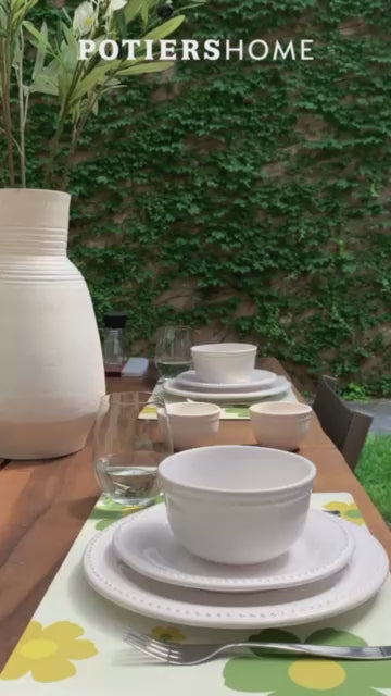 La vajilla Queen se distingue por su borde clásico con detalle de perlas, que combina la elegancia de una mesa sofisticada con la calidez de lo artesanal.