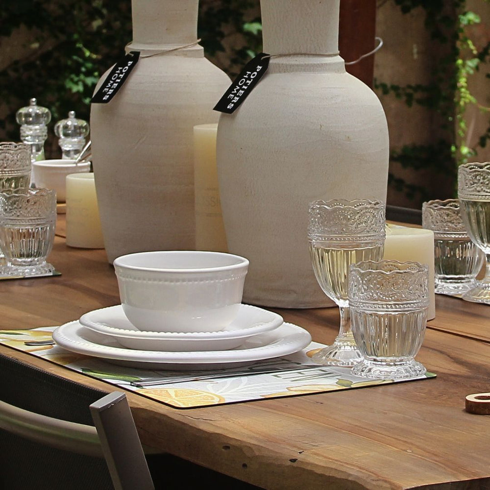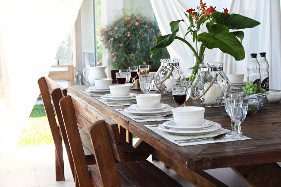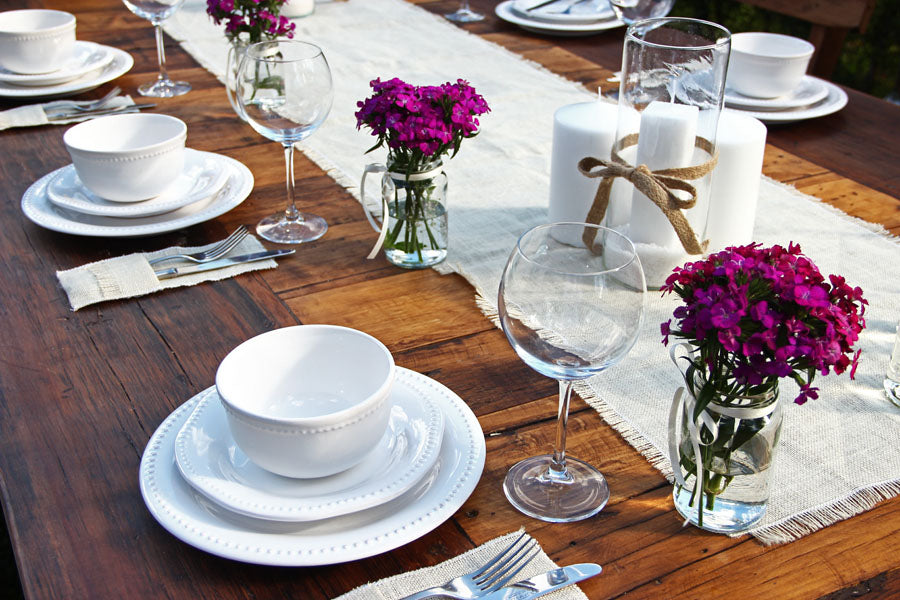 La línea Queen se destaca por sus bordes con perlas en relieve, aportando un estilo elegante y versátil que viste la mesa en cualquier ocasión.