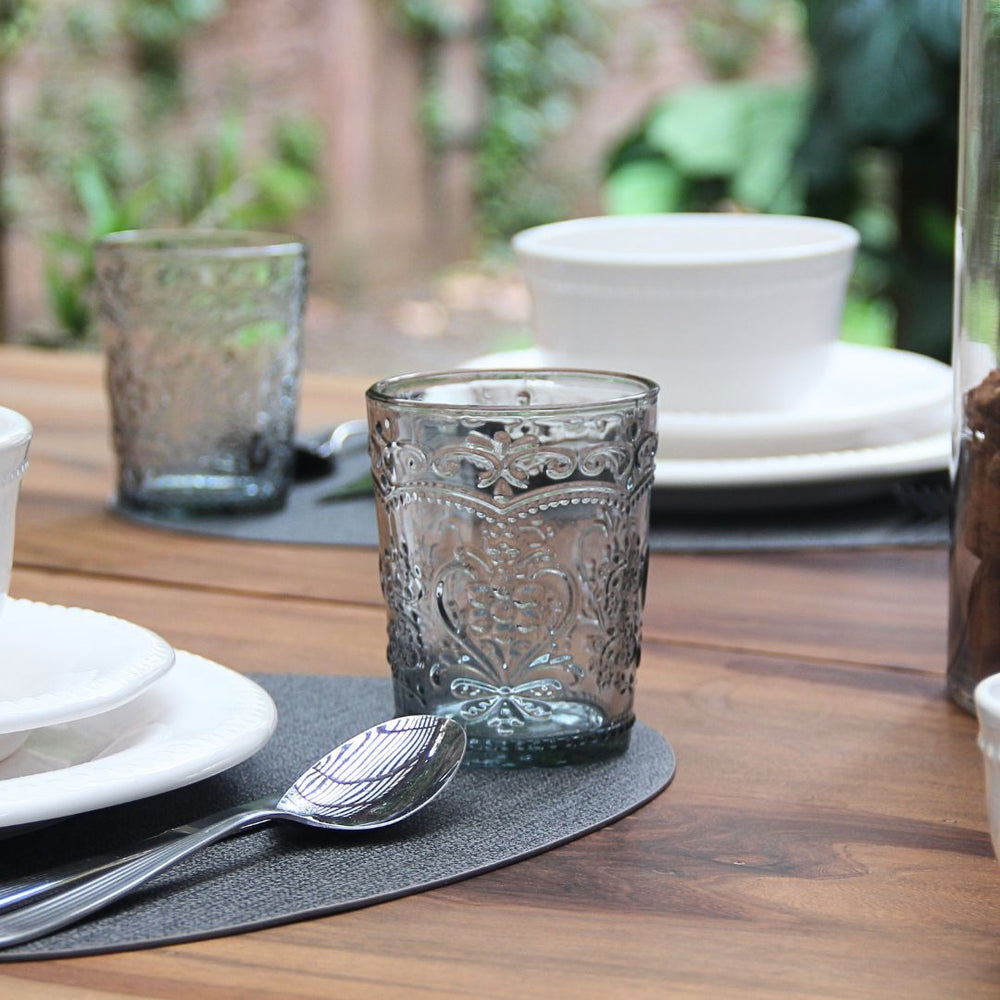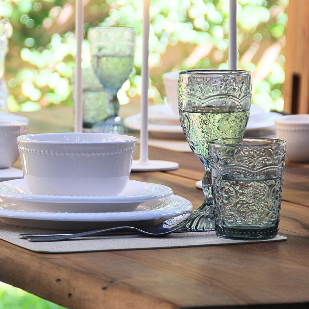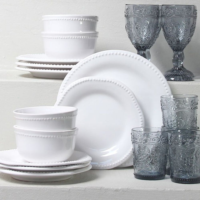 La vajilla Queen se distingue por su borde perlado y su cerámica blanca brillante. Acompañada por el diseño tallado y color ahumado de las copas y vasos Hampton Blue, este set eleva cualquier ocasión.