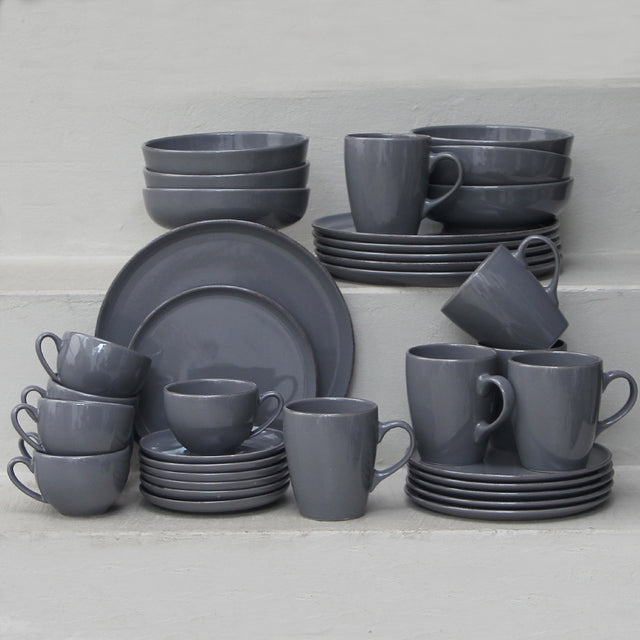 Este set completo en gres combina la sobriedad del gris con una textura artesanal que realza cualquier mesa.