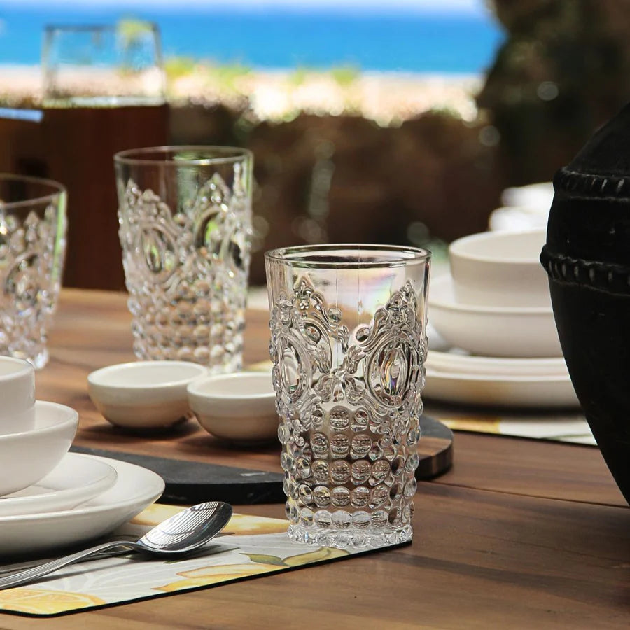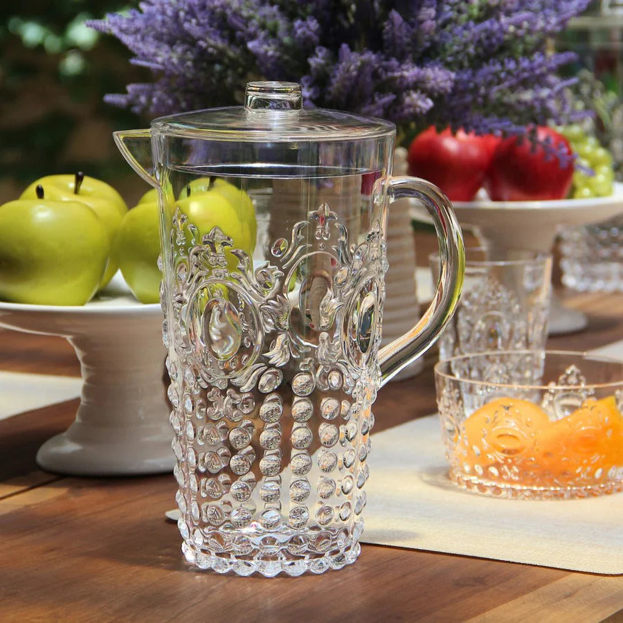 Este juego incluye 6 vasos altos y 1 jarra de acrílico Imperial, diseñados con relieves en Flor de Lis que evocan elegancia atemporal.