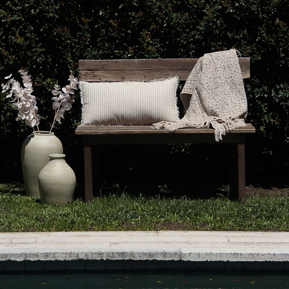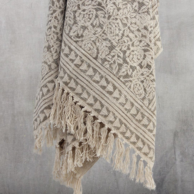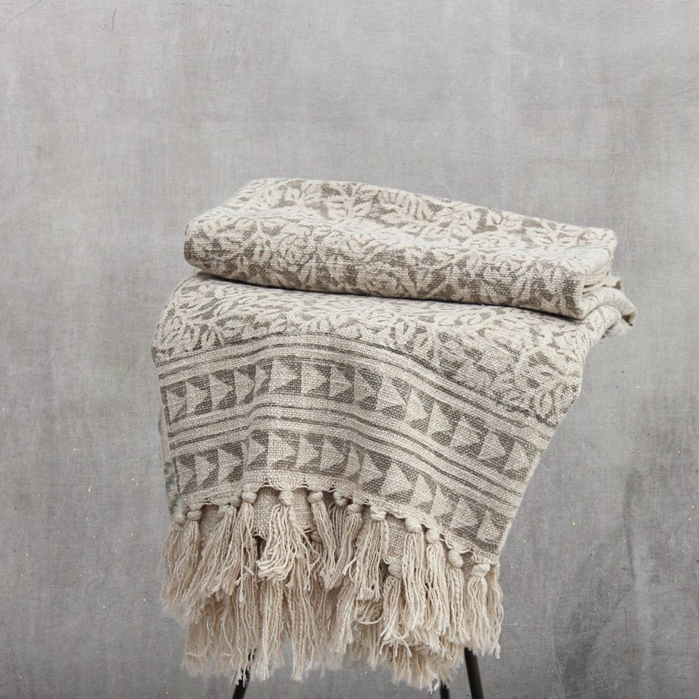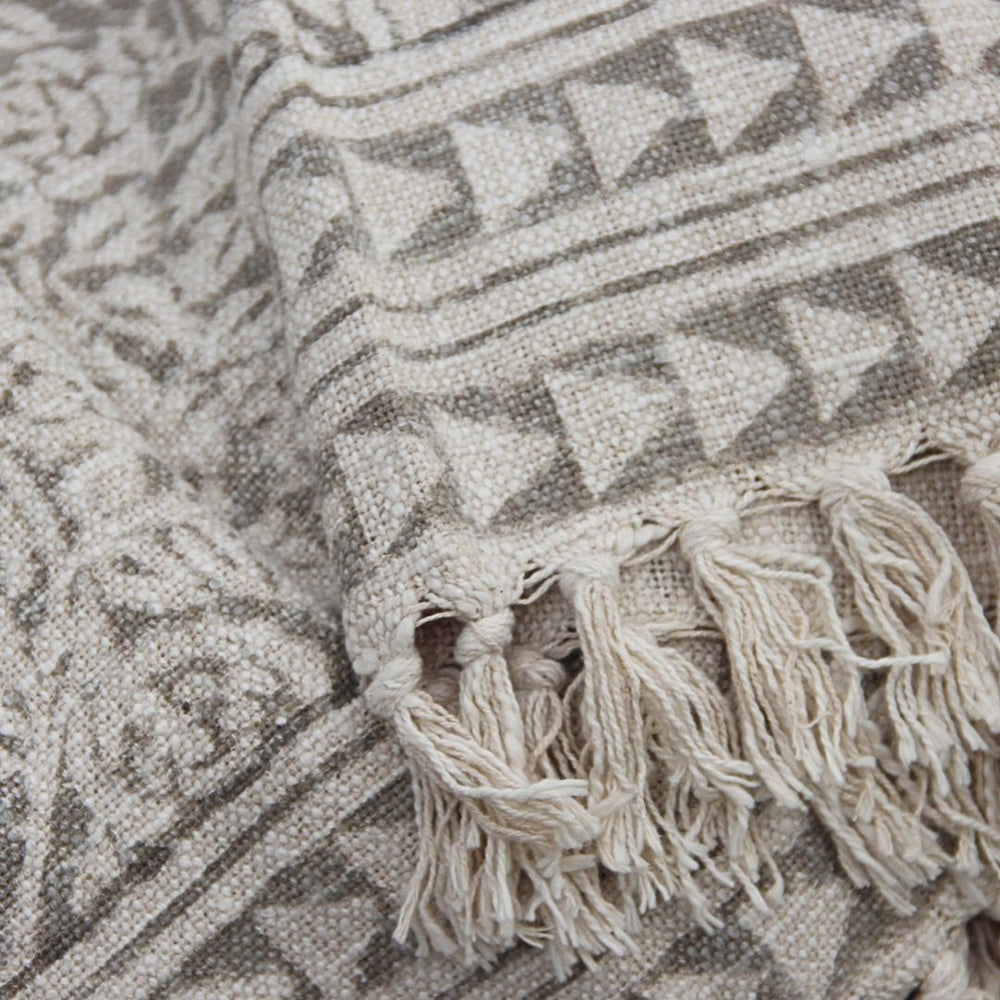 Confeccionada en 100% algodón natural, la Manta Varanasi combina motivos geométricos y florales en tonos beige y gris suave que evocan la rica herencia cultural india.