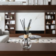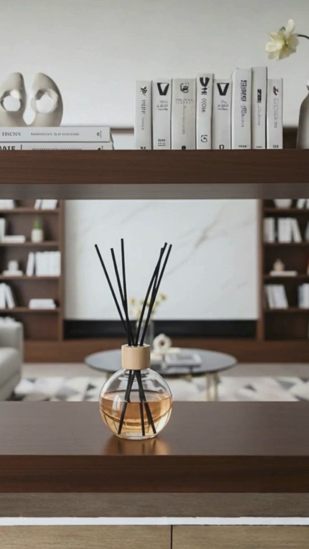 Ubicalo en un estante de baño o mesa de luz con varillas naturales y una vela blanca.