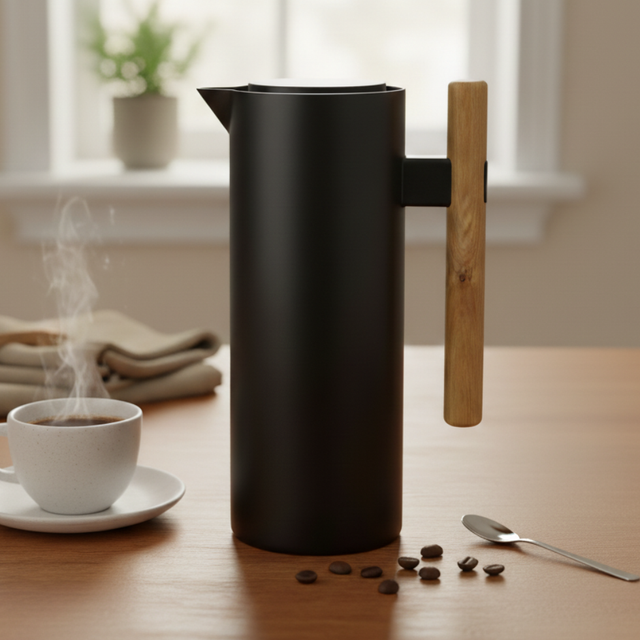 La Jarra Térmica Nórdica Negra combina minimalismo y sofisticación en un diseño atemporal. Su acabado mate en negro profundo, realzado con el detalle del mango en madera natural, aporta carácter y elegancia a cualquier mesa.