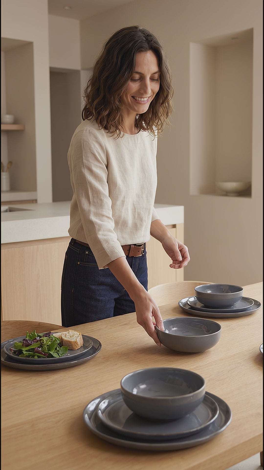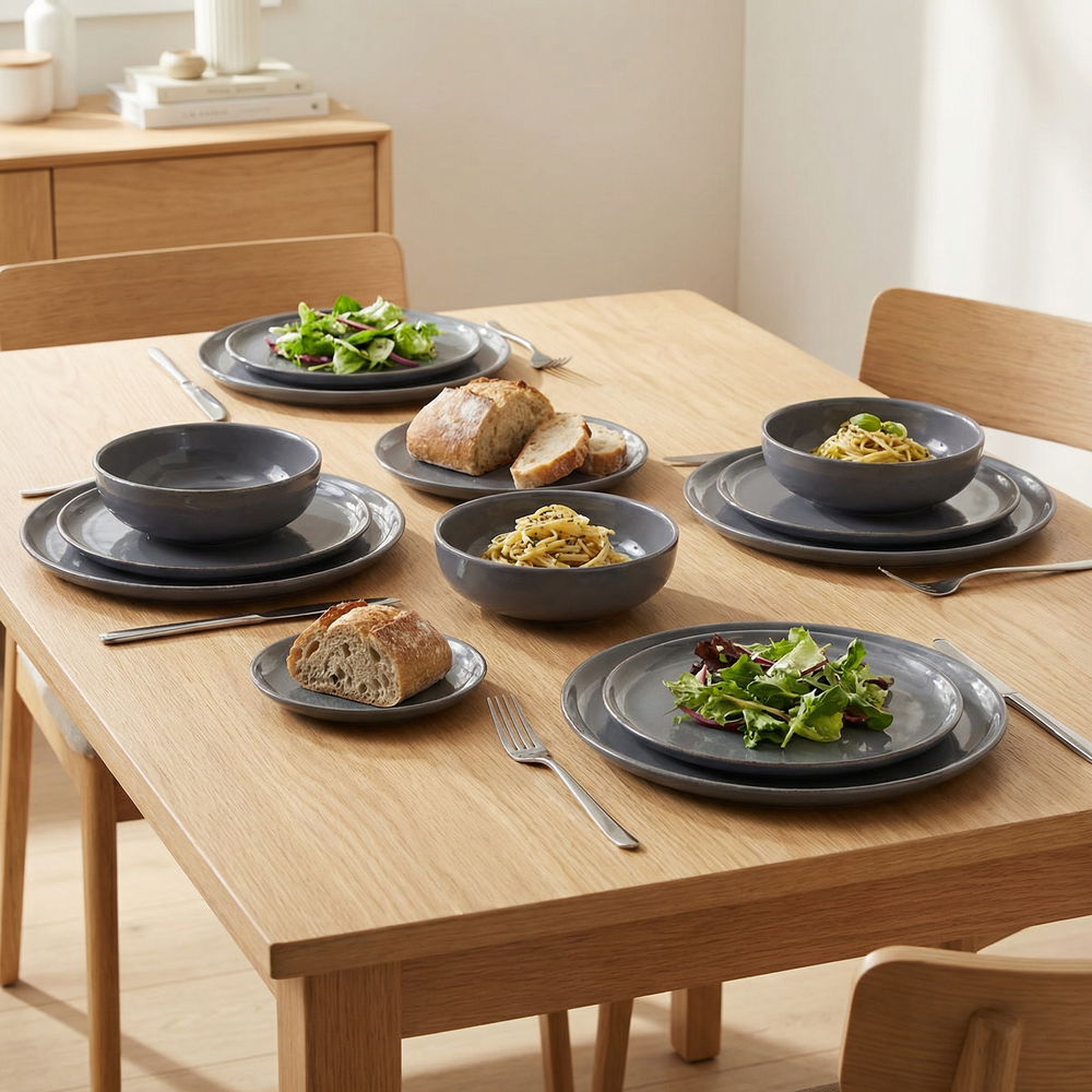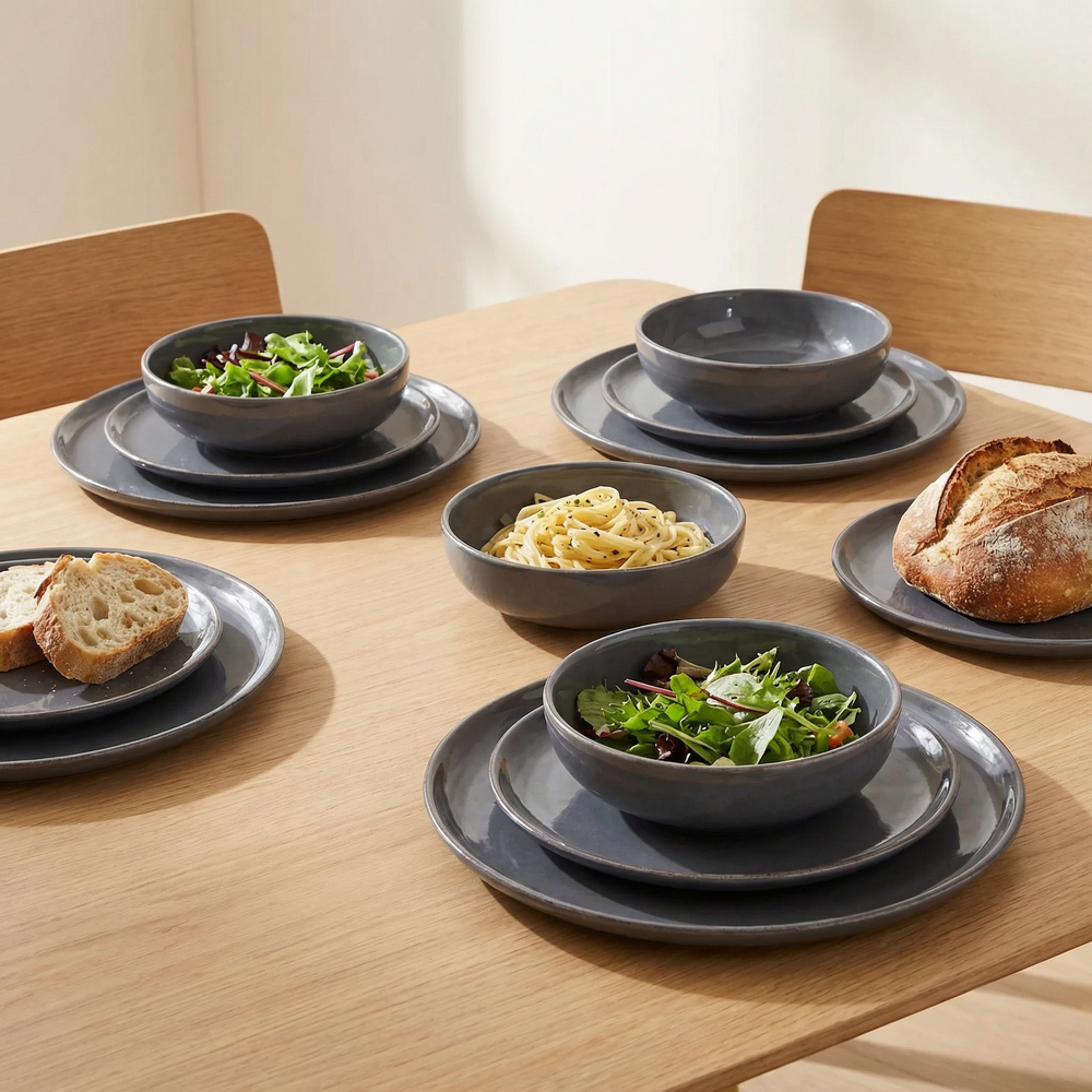 El set Positano Grey combina formas simples, terminación artesanal y un tono gris profundo que eleva cualquier mesa cotidiana.