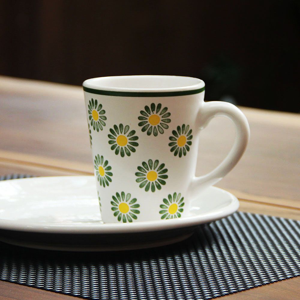 Con su estampado de margaritas verdes y centro amarillo, este Jarro es un guiño a la frescura de la naturaleza. Ideal para quienes aman los detalles florales y quieren sumar un toque de alegría y color a sus momentos de café o té.