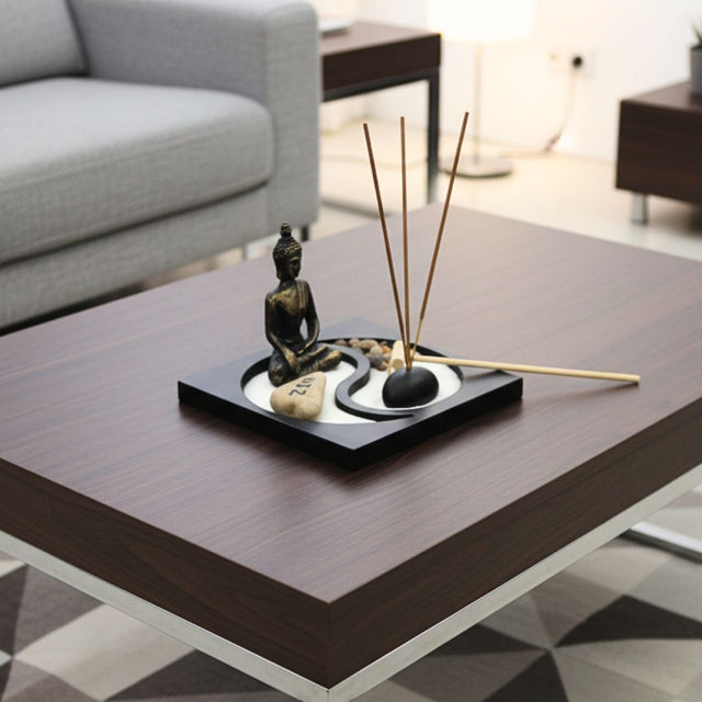 El Jardín Calm Spirit Zen Path representa la dualidad perfecta entre energía y serenidad. Su base cuadrada con diseño yin-yang, arena blanca y piedras naturales evoca el balance entre cuerpo y mente, mientras la figura del Buda meditativo invita a la introspección y la armonía.