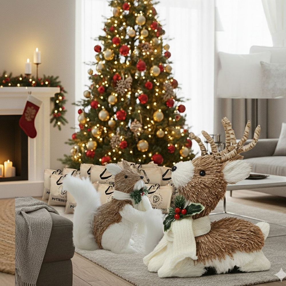 El Reno Sentado Joy 27 cm es pura dulzura y calidez navideña. Con su bufanda tejida blanca 🧣 y un delicado arreglo de pino y bayas, este adorable reno transmite toda la magia del invierno en un diseño artesanal que enamora.