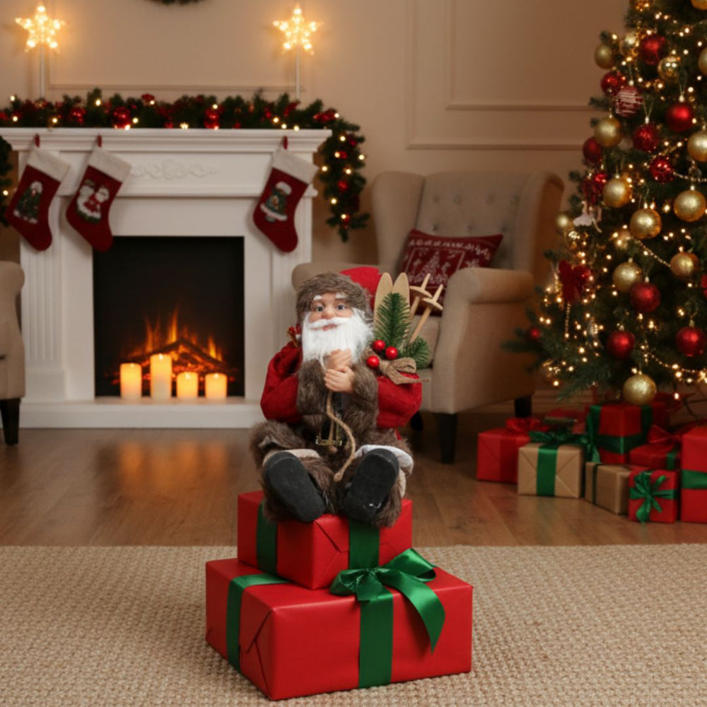 El Santa Sentado es una figura decorativa que irradia calidez y espíritu navideño. Vestido con tonos naturales, detalles en piel sintética y gorro rojo clásico, este Papá Noel combina el estilo tradicional con una estética nórdica y acogedora. Perfecto para sumar un toque mágico y hogareño a cualquier rincón.