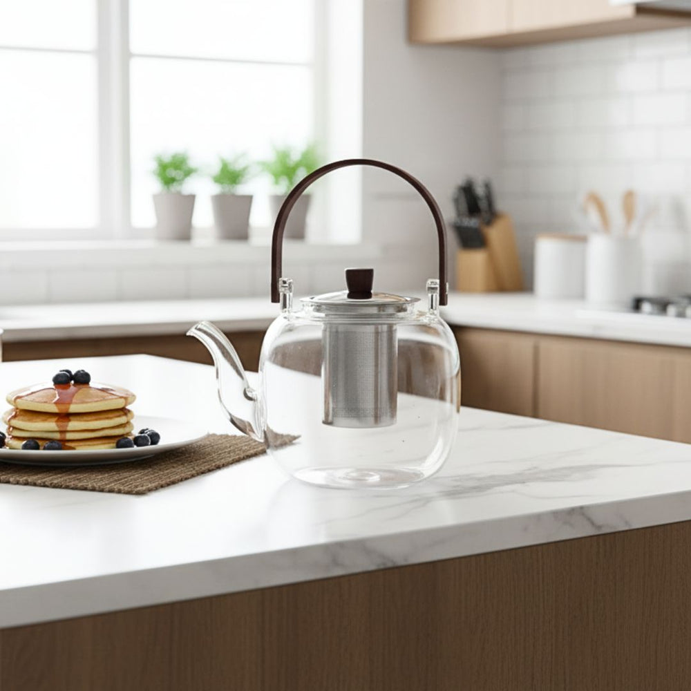 El mango de madera le aporta un toque cálido y ergonómico, que contrasta con la transparencia del vidrio y realza su diseño contemporáneo. Ideal para té verde, negro o de hierbas, esta tetera es perfecta tanto para uso diario como para acompañar momentos de relax o reuniones con amigos.