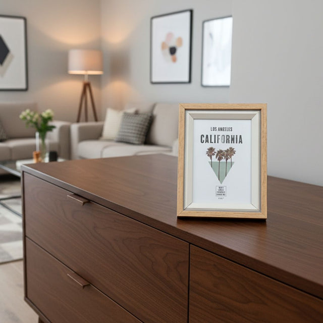 El Portarretratos California – 13x18 cm combina el encanto del estilo urbano con la frescura de la costa californiana. Con marco box en madera clara y diseño interior con palmeras y tipografía moderna, aporta un aire cosmopolita y relajado que transforma cualquier rincón en un espacio con personalidad.