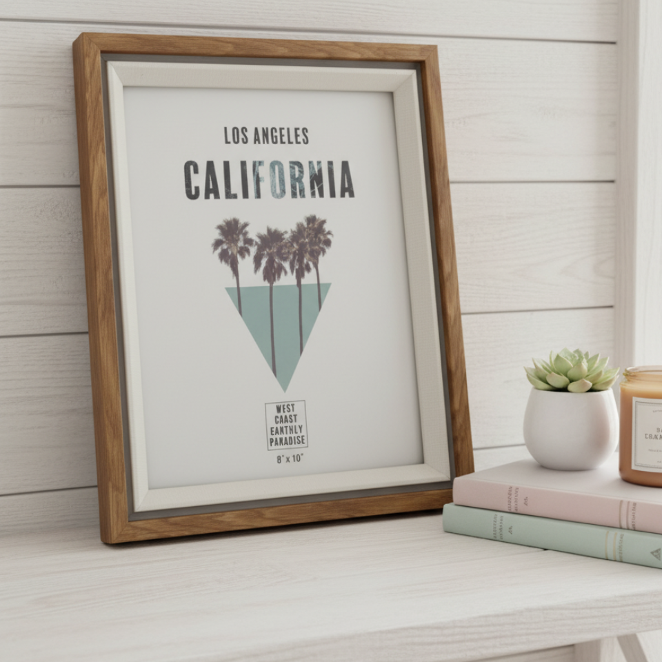 El Portarretratos California – 20x25 cm combina el espíritu relajado de la costa oeste con un diseño minimalista y moderno. Su marco box en madera clara resalta la gráfica urbana de palmeras, evocando la esencia de Los Ángeles y un aire siempre veraniego.