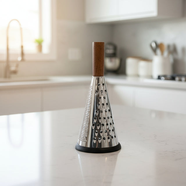 El Rallador Cónico Gourmet combina el brillo del acero inoxidable con la calidez de la madera natural. Su formato cónico facilita el uso y aporta un toque elegante y moderno a la cocina. Ideal para rallar quesos, verduras o frutas con comodidad y precisión.