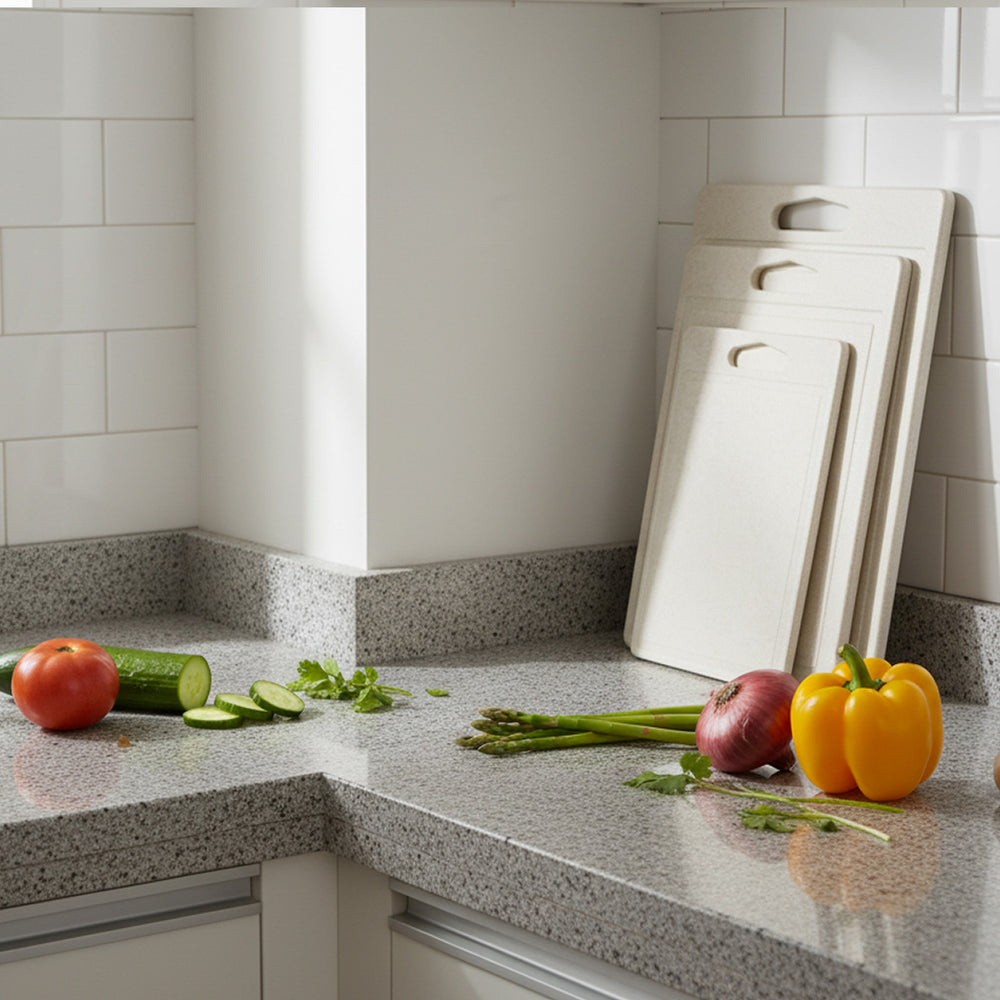 Su color beige con textura efecto piedra aporta un toque cálido y contemporáneo a la cocina, ideal tanto para preparar alimentos como para presentar quesos, frutas o fiambres con estilo.