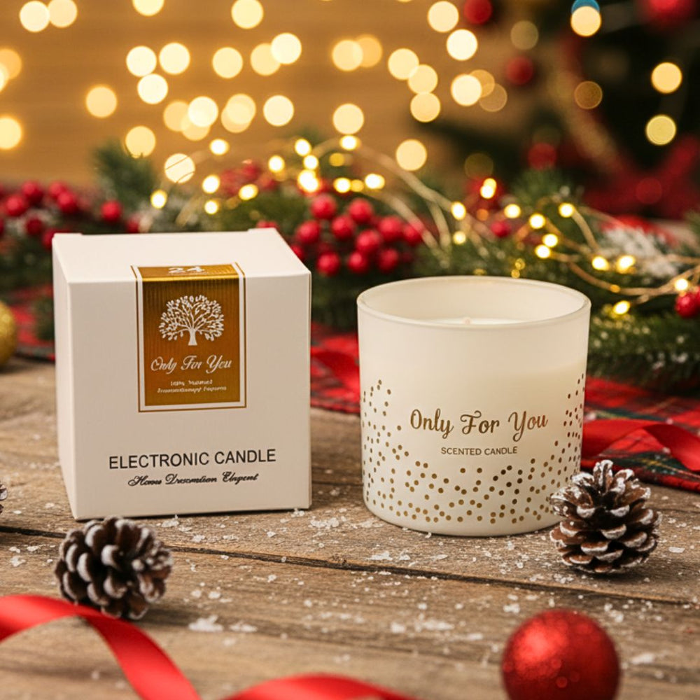 Con vaso de vidrio blanco mate y detalles dorados, aporta luz cálida y un aroma delicado que transforma cualquier espacio en un ambiente acogedor.