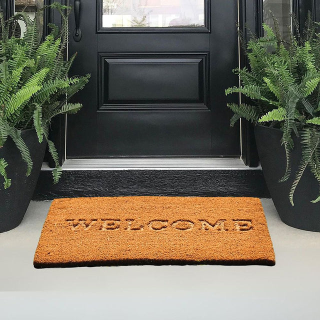 El Felpudo Welcome Calado está confeccionado en fibra de coco natural con base de PVC antideslizante, ofreciendo resistencia y firmeza con un diseño sobrio: la palabra WELCOME calada, que recibe a tus visitas con un toque distinguido.