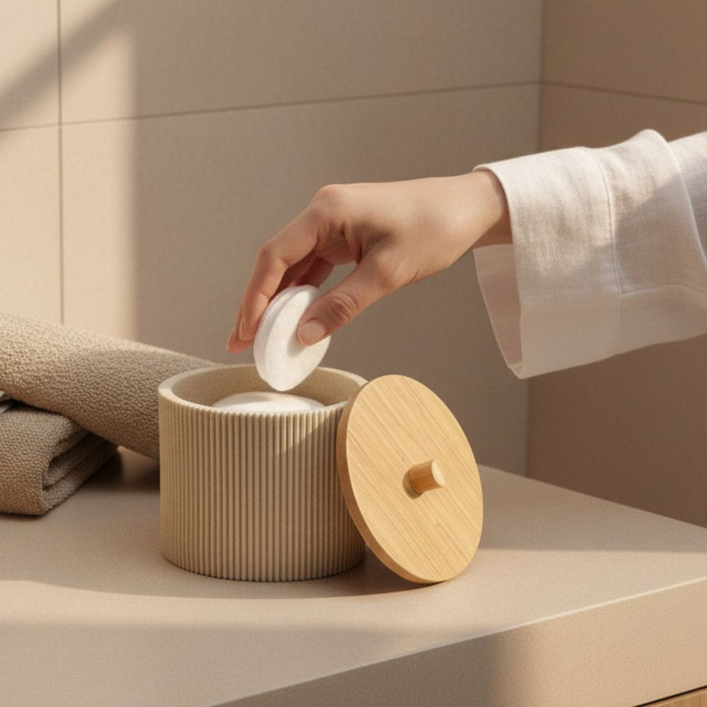 Fabricado en resina y acompañado por una tapa de bambú, aporta equilibrio visual y una sensación de orden que se integra con facilidad a baños modernos y relajados.