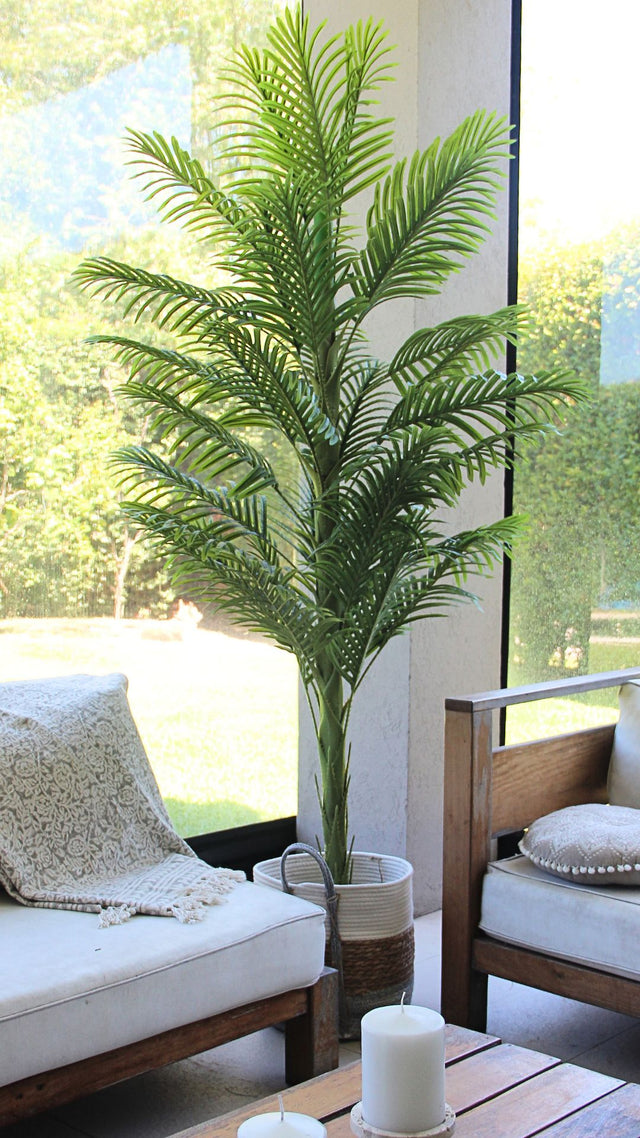 Transforma cualquier espacio en un oasis tropical con nuestra Palma Areca Artificial. Su diseño realista, con hojas alargadas en tonos verdes vibrantes y detalles cuidadosamente elaborados, aporta frescura y elegancia a interiores y exteriores.