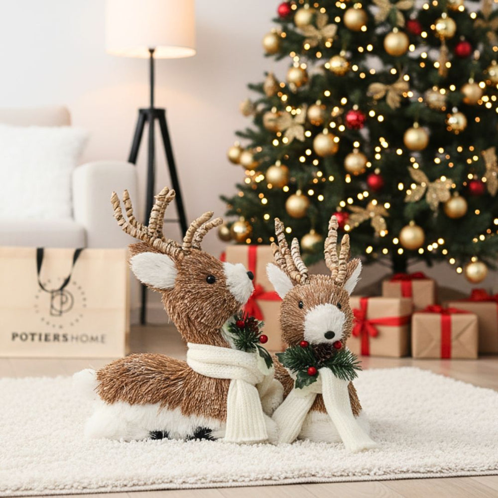 El Reno Sentado Joy 27 cm es pura dulzura y calidez navideña. Con su bufanda tejida blanca 🧣 y un delicado arreglo de pino y bayas, este adorable reno transmite toda la magia del invierno en un diseño artesanal que enamora.
