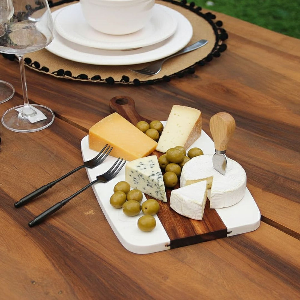 La Tabla Mármol Blanco Rectangular con Mango combina la pureza del mármol blanco con la calidez de la madera de acacia, creando una pieza única que aporta distinción a tu mesa o cocina. Ideal tanto para usar como tabla de corte como para presentar picadas, frutas o quesos con un toque gourmet.
